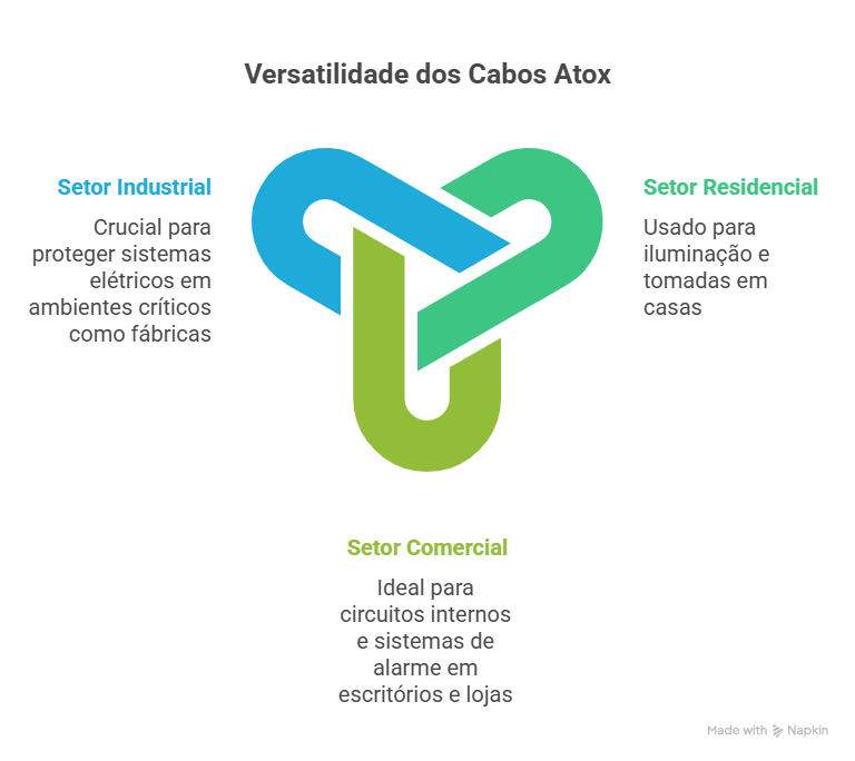 Em instalações comerciais, como escritórios e lojas, esses cabos são ideais para circuitos elétricos internos e sistemas de alarme, onde a segurança contra incêndios é uma prioridade. Já no setor industrial, a aplicação de cabos Atox é crucial para garantir a proteção de sistemas elétricos em ambientes críticos, como salas de máquinas e fábricas, que exigem produtos com alta resistência e durabilidade.